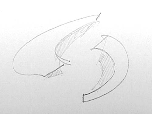 De gebogen schermen kunnen afzonderlijk of in relatie tot elkaar worden toegepast. Samen omsluiten zij een ruimte. Zij kunnen op verschillende afstanden liggen (beweeg de cursor over de schets).